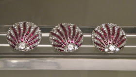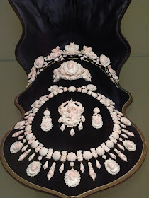 Set of coral jewelry. Italian, 1860. This luxurious five-piece set with tiara, bracelet,necklace, brooch and earrings, is a remarkable survival. It is carved entirely from pale pink coral, known as "angel's skin", whick was highly prized in the mid-19th century and much more expensive than dark red coral. Coral has amuletic properties and has been worn for centuries to ward off evil. It the early 19th century strings of large coral beads were widespread. This, however, is an exquisitely decorative piece: the motifs echo the marine origins of coral - mermaids, tritons, dolphins, shells, hippocamps.