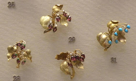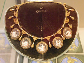 Gold and diamond necklace with "Pompeian-style" medallions. French, 1867-73. Here enamel medallions inspired by the Roman wall-paintings at Pompeii are combined with pendant drops and butterflies taken from Hellenistic Greek fringe necklaces.