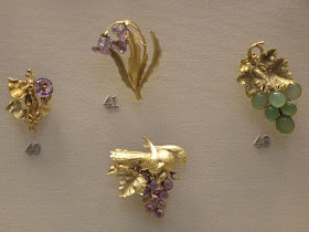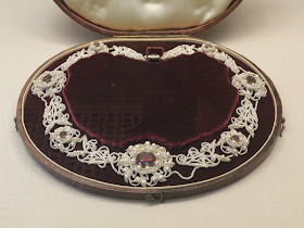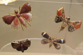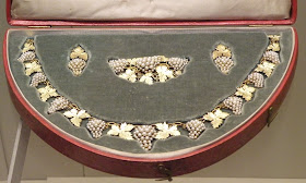 This one is rather weird piece of jewelry but was quite popular at the time. Necklace of humming birds' heads. English, 1865-70. This startling jewel incorporates feathers from the heads of green and scarlet hummingbirds, imported from Brazil for costume and accessories.