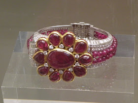 Ruby and diamond bangle. Cartier, 1937. The central motif with cabochon rubies set in gold is Indian. The back is enamelled with flowers. To set off this antique Indian ornament Cartier created a contrast: an up-to-date asyimmetrical rigid scroll, edged with geometric baton diamonds. The two rows of strung ruby beads preserve the Indian character of the central motif.