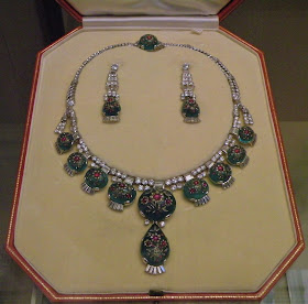 Necklace and earrings. Cartier, 1937. The cabochon emeralds inlaid with ruby and diamond flowers are Indian work of the 19th century, set in Western style with baton diamonds.