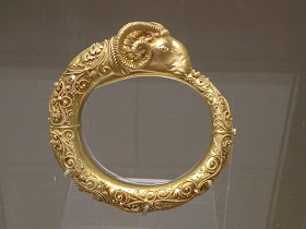 Ram's head bangle. Italian, 1870. Gold with beading, pattern grainwork and wirework, and applied chased leaves.