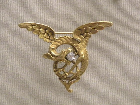 Tiger-claw brooch with portrait of a tiger. English, 1870. The tiger-claw is traditionally a potent amulet in India, believed to deflect evil spirits and impart the tiger's strenght to the wearer. Tiger-claws were often brought back as souvenirs of big-game hunting and mounted as jewels.